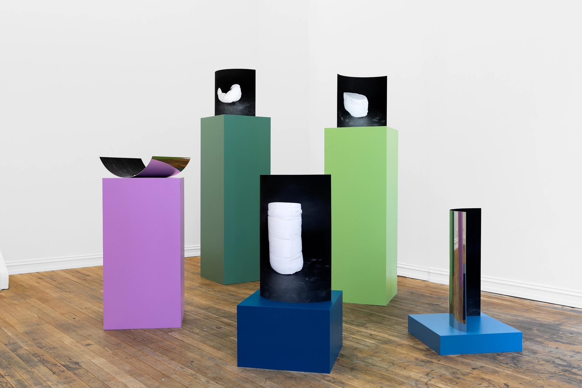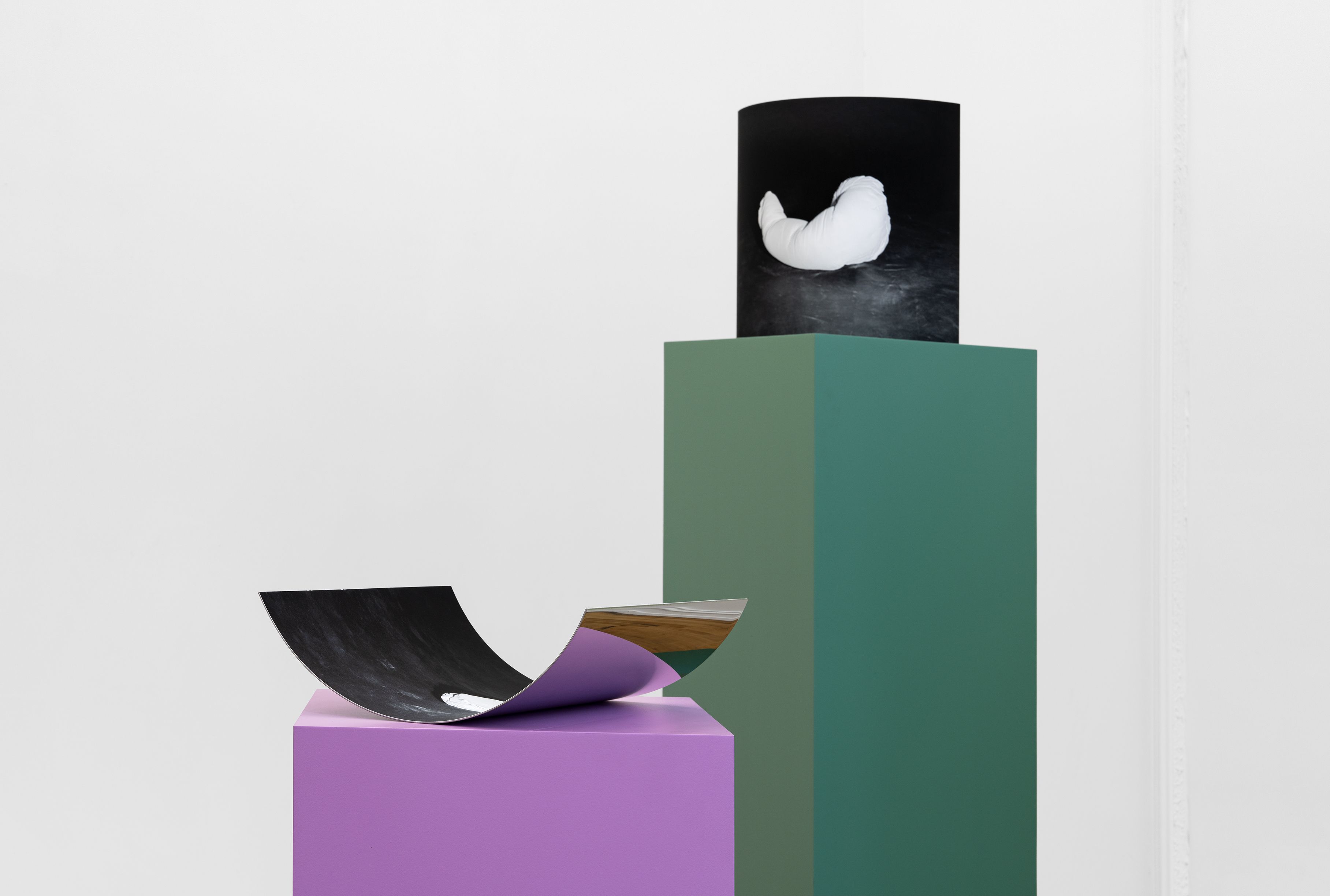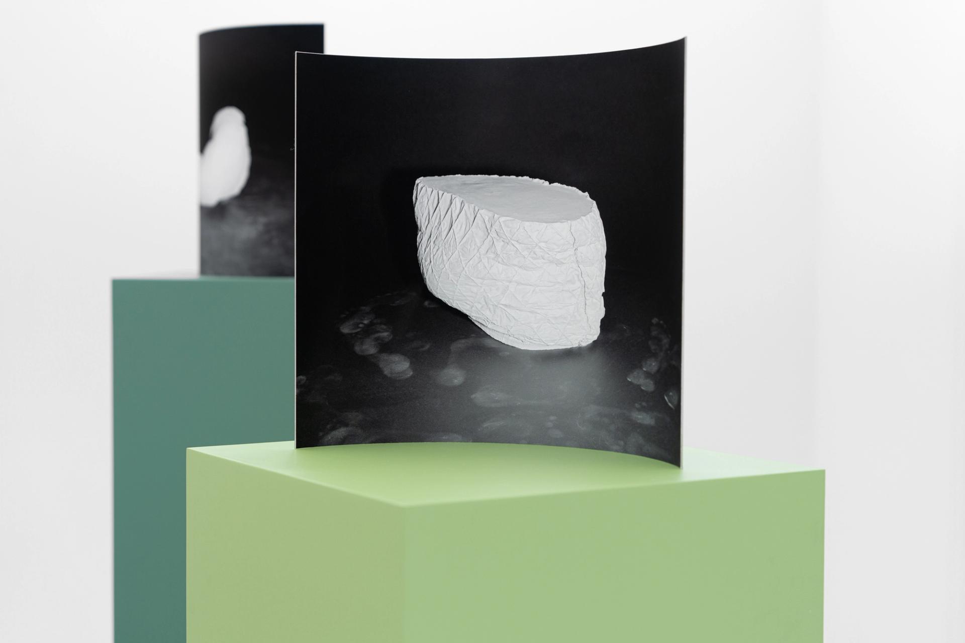 Shadow Imprints is divided in two parts. Part one is the sculptural series Gerd. A collection of clothes of personal importance has been cast, and the filled insides shaped to bodies. The work presented are photographic fixations of these bodies mounted on metal sheets. They have the shapes of concave and convex mirrors. Part two is the photograph on the wall called Shadow Imprints – a documentation of the sculptural work Gerd as a negative image and an attempt to develop the bodies in a photographic process.