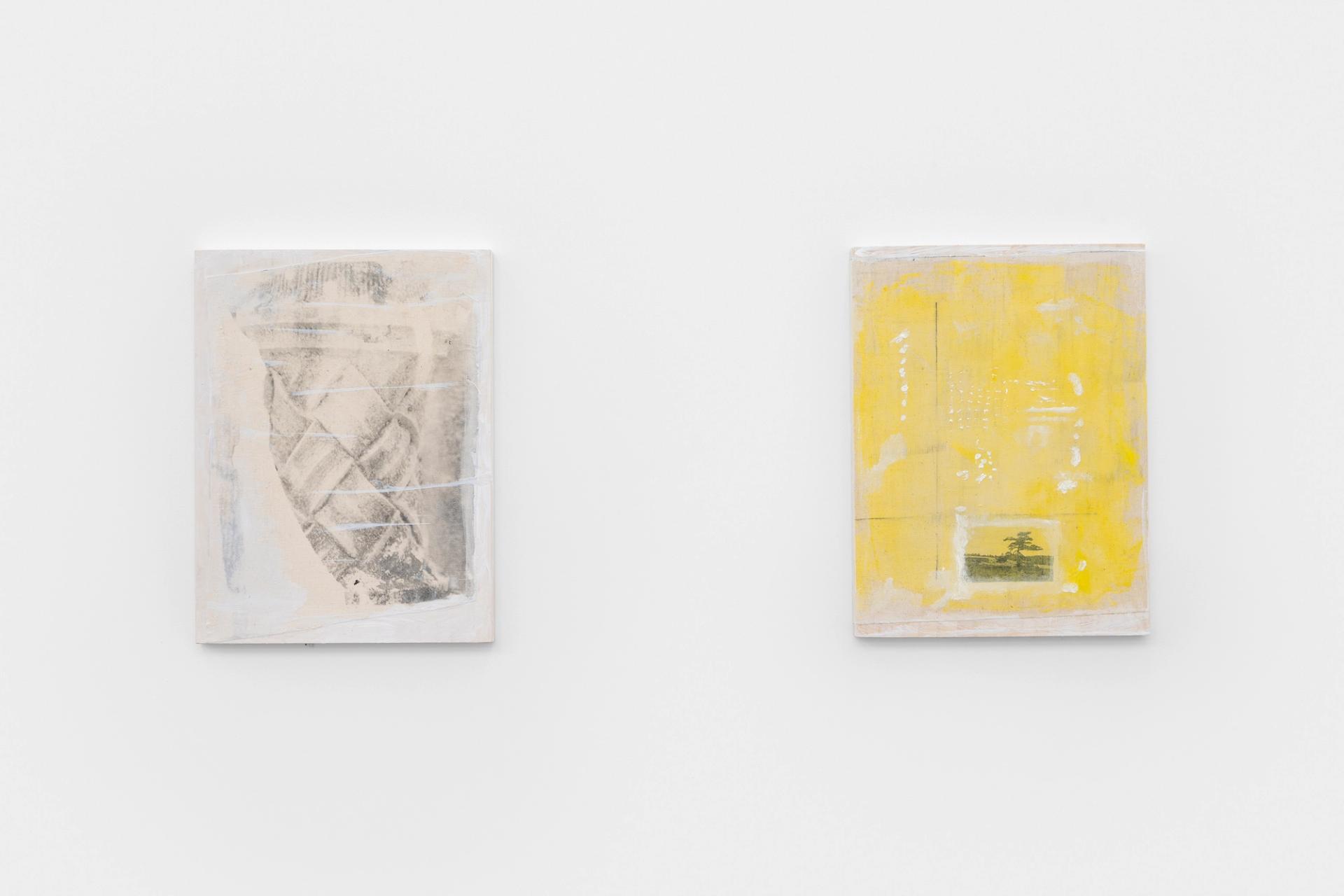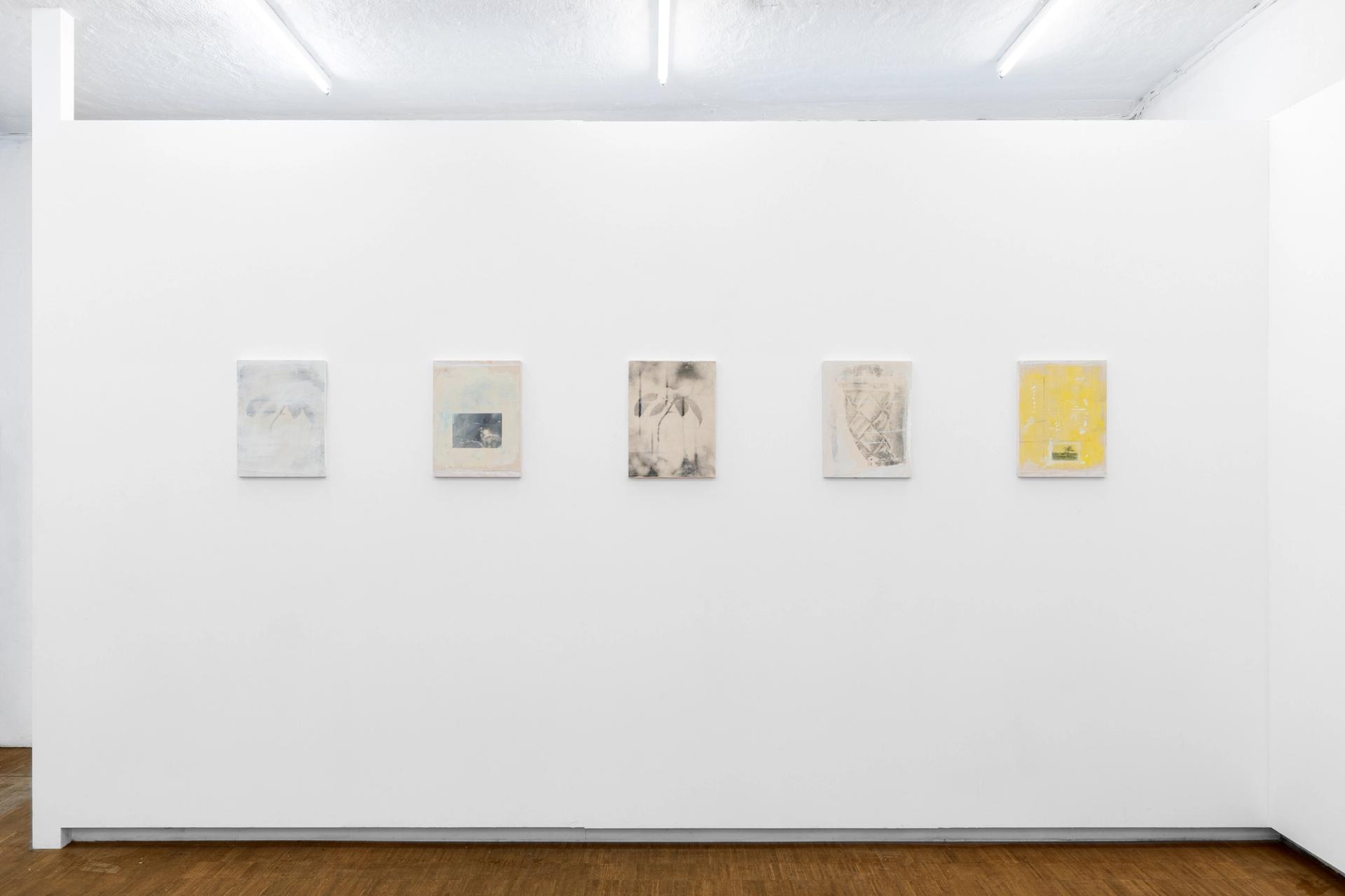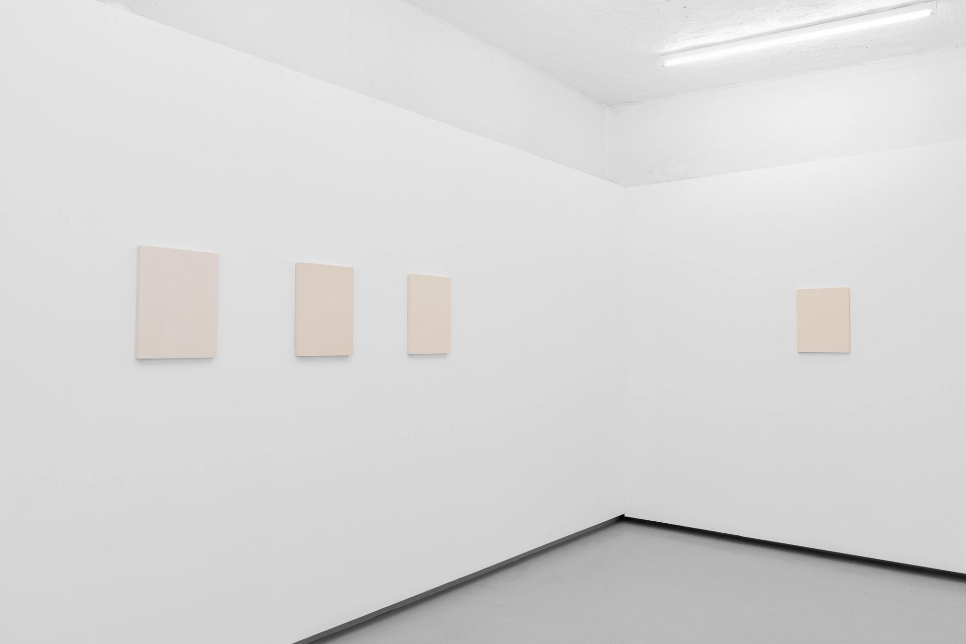 At the end space of the gallery, a series of five paintings are presented with the title Tabula rasa. Made by layering chalk and glue on cotton canvas on wooden board, the paintings look empty and unstarted by first impression, like clean slates ready for anything to appear.